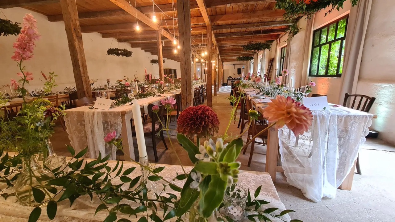 Romantická stodola s drevenými trámami, prírodnými dekoráciami a otvorené priestory na svadbu. Ideálna pre menšie až stredne veľké svadby, kde každý detail – od svetielok po rustikálne dekorácie – prispieva k autentickej atmosfére. Okolie poskytuje priestor pre fotenie a relax hostí medzi jednotlivými časťami svadby.